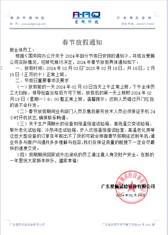 廣東愛佩試驗設(shè)備有限公司春節(jié)放假通知